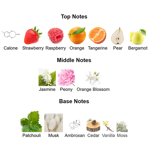 Top notes are Calone, Strawberry, Raspberry, Orange, Tangerine, Pear and Bergamot; middle notes are Jasmine, Peony and Orange Blossom; base notes are Patchouli, Musk, Ambroxan, Cedar, Vanilla and Moss.