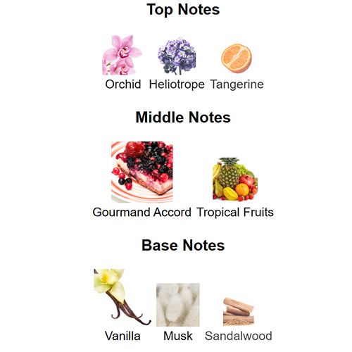 Top notes are Orchid, Heliotrope and Tangerine; middle notes are Gourmand Accord and Tropical Fruits; base notes are Vanilla, Musk and Sandalwood.