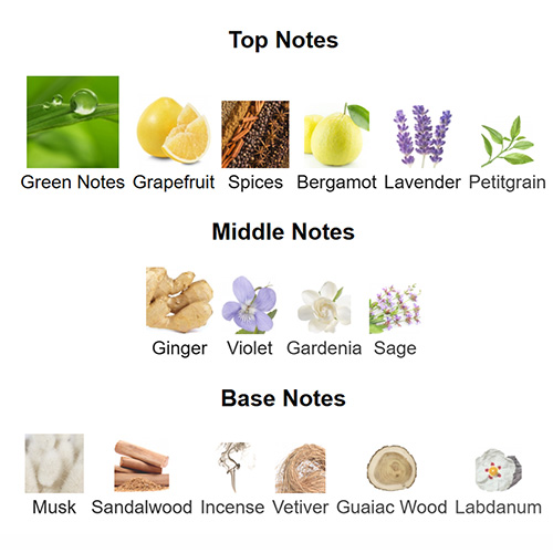 Top notes are Green Notes, Grapefruit, Spices, Bergamot, Lavender and Petitgrain; middle notes are Ginger, Violet, Gardenia and Sage; base notes are Musk, Sandalwood, Incense, Vetiver, Guaiac Wood and Labdanum.