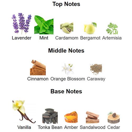 Top notes are Lavender, Mint, Cardamom, Bergamot and Artemisia; middle notes are Cinnamon, Orange Blossom and Caraway; base notes are Vanilla, Tonka Bean, Amber, Sandalwood and Cedar.