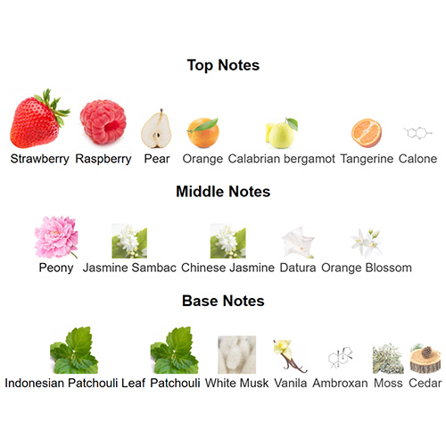 Top notes are Strawberry, Raspberry, Pear, Orange, Calabrian bergamot, Tangerine and Calone; middle notes are Peony, Jasmine Sambac, Chinese Jasmine, Datura and Orange Blossom; base notes are Indonesian Patchouli Leaf, Patchouli, White Musk, Vanila, Ambroxan, Moss and Cedar.